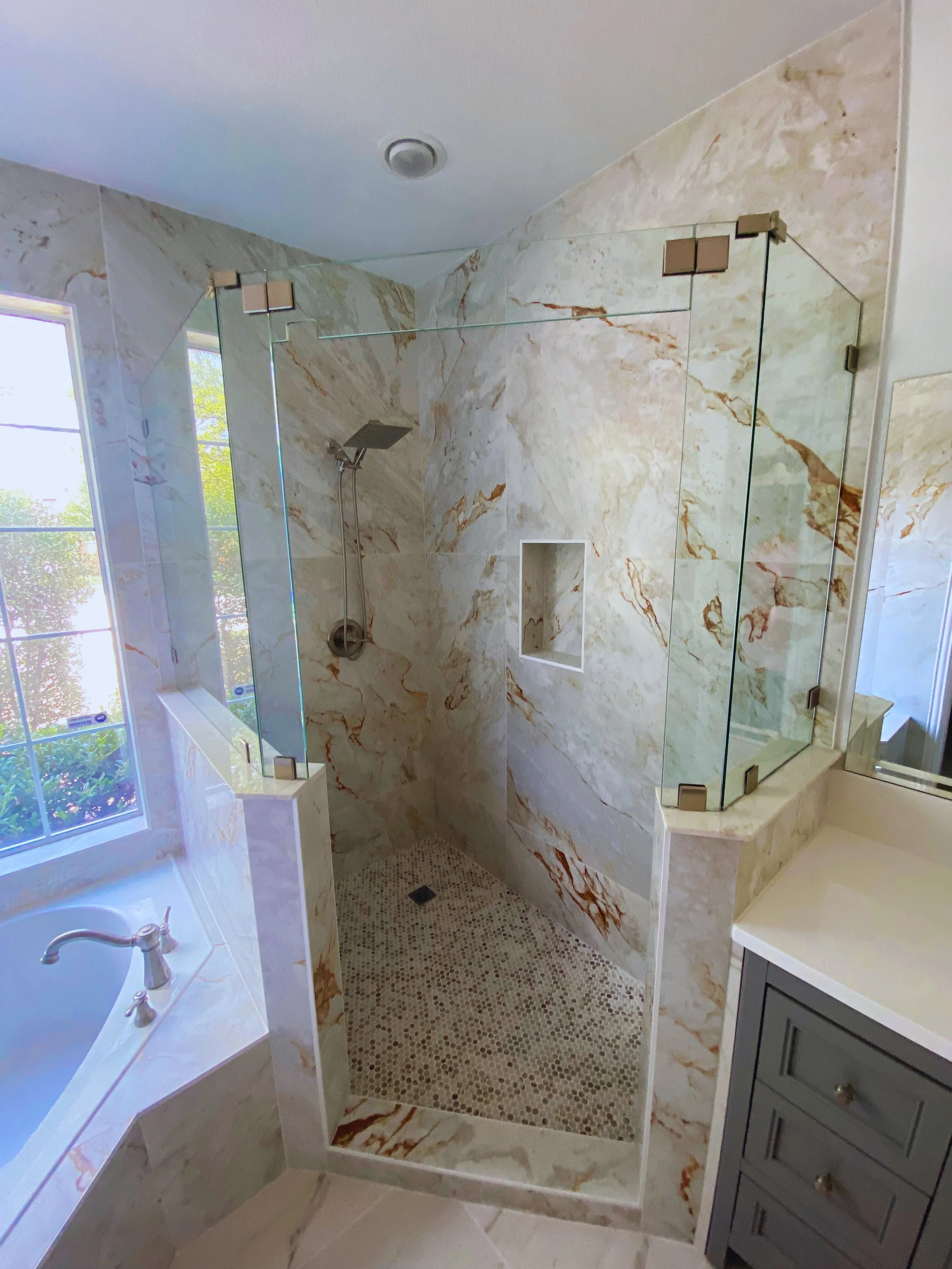 Walk-in showers are one of the most valuable bathroom upgrades for DFW homeowners. We build custom shower systems that improve accessibility, safety, and modern appearance while reducing maintenance.
